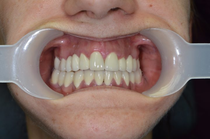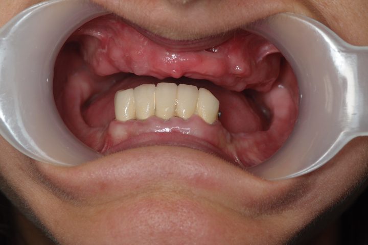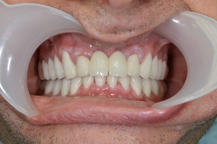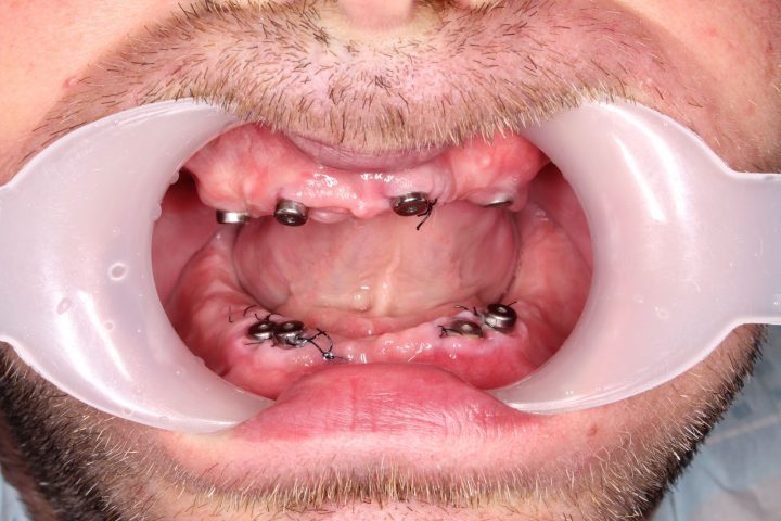Die Operation dauert zweimal 1,5 Stunden lang, und wurde der provisorische Zahnersatz im Ablauf den 5 Tagen fertig. Nach der 3 Monate langen Heilungszeit wurden zwei Stegprothesen auf 4-4 Implantate befestigt.