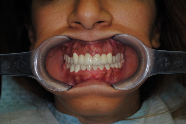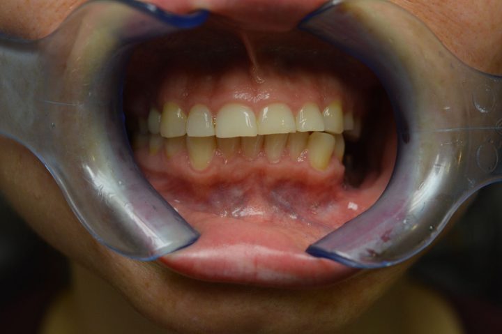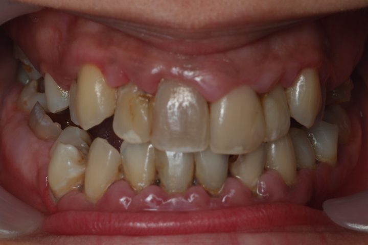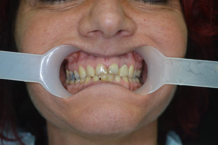Sofie ist eine 43-jährige norwegische Patientin. Seit mehreren Jahren hat sie nur gesehen, dass ihre Zähne abnützen und verkürzen. Sie wurde mit diesen Zähnen immer älterer ausgesehen. Seit ihrer Kindheit hat die durcheinanderstehenden Zähnen sie gestört, und unten linkt hat sie eine Zahnlücke, die beim Essen sehr unangenehm war. Aus diesen Gründen hat sie uns aufgesucht,