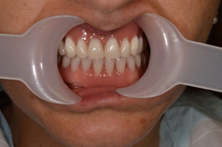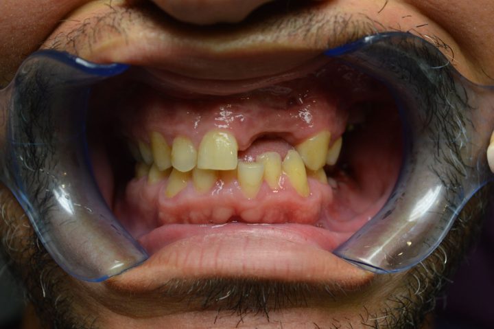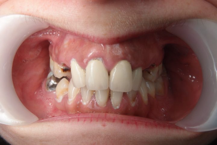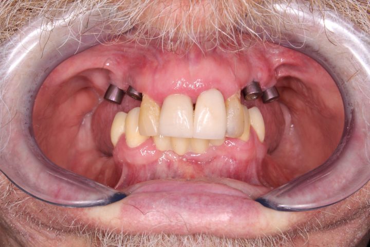 Im ersten Schritt hat Herr Dr. Szendrei die rettungslosen Zähne entfernt und im Ablauf den 5 Tagen wurde provisorischen Zahnersatz angefertigt.