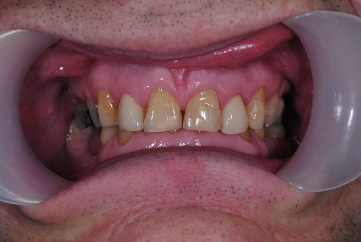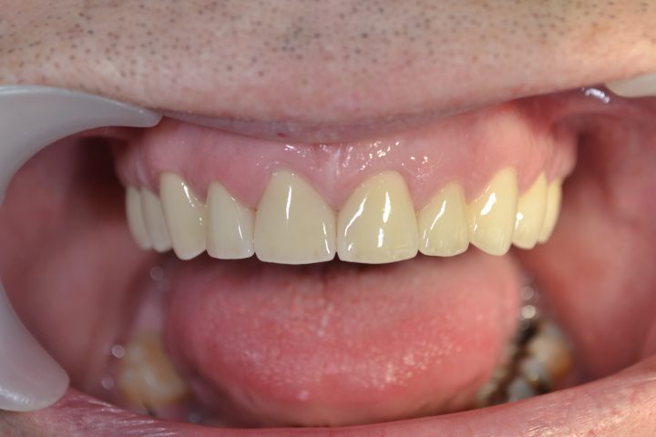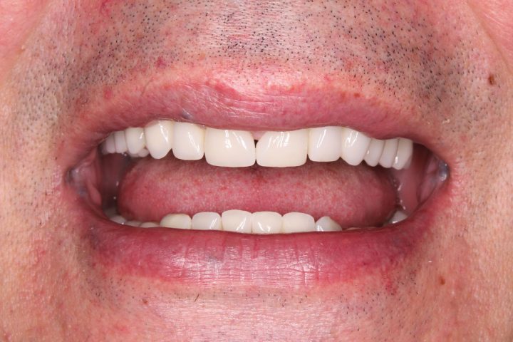 Er hat unten, in die Kauenregion 2-2 Implantate bekommen. Nach der 6 Monate lange Heilungszeit wurden metallfreie Zirkonkronen auf den Frontzähnen bearbeitet, und auf Implantate Metallkeramik Kronen hergestellt.