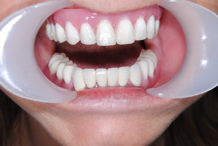 Deswegen wurde eine Vollprothese oben angefertigt, und unten auf ihren eigenen Zähnen einen Brückenglied.