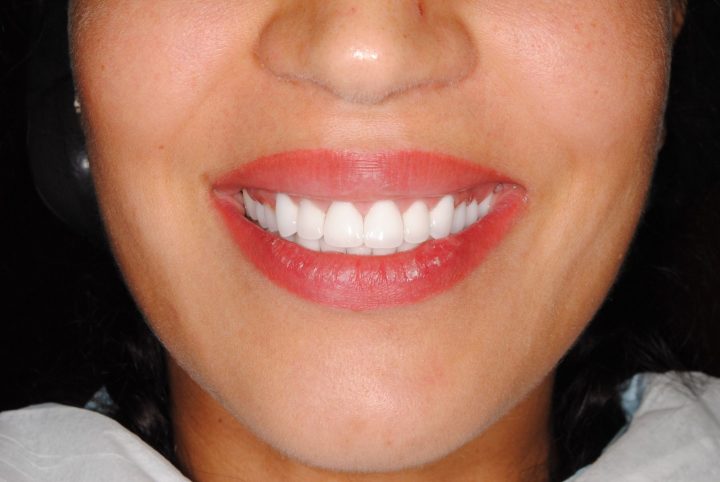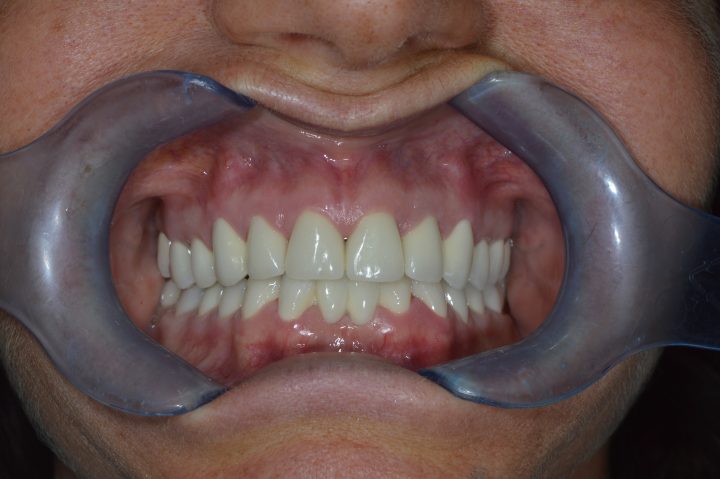 Danach war die Heilungszeit, die 3 Monate lang dauerte. Nach Ende der Heilungszeit haben wir festsitzende Kronen auf ihren eigenen Zähnen, und auf Implantaten bearbeitet, damit das ästhetische Problem und die Zahnlücke gelöst haben.